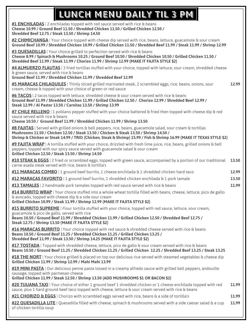 Guests rave about the authentic taste that transports you straight to Mexico, complemented by friendly service and a cheerful ambiance. Whether it's Taco Tuesday or a family celebration, Las Maracas delivers an unforgettable dining experience filled with delicious memories.